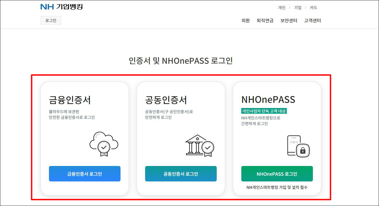 기업인터넷뱅킹 이용을 위해 사전에 발급받은 아이디(ID)와 비밀번호를 입력합니다. 보안카드나 OTP(일회용 비밀번호 생성기), 공인인증서 등 추가적인 보안 수단을 요구할 수 있으니 준비해 두세요.