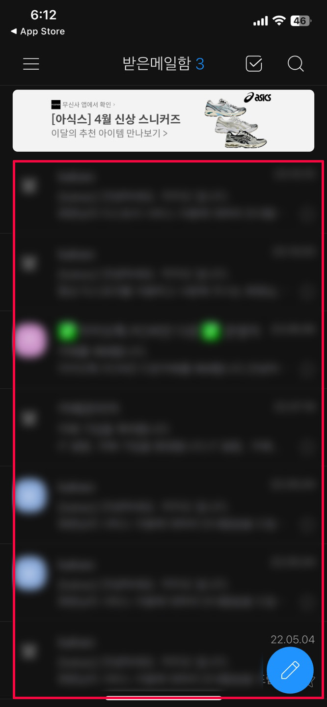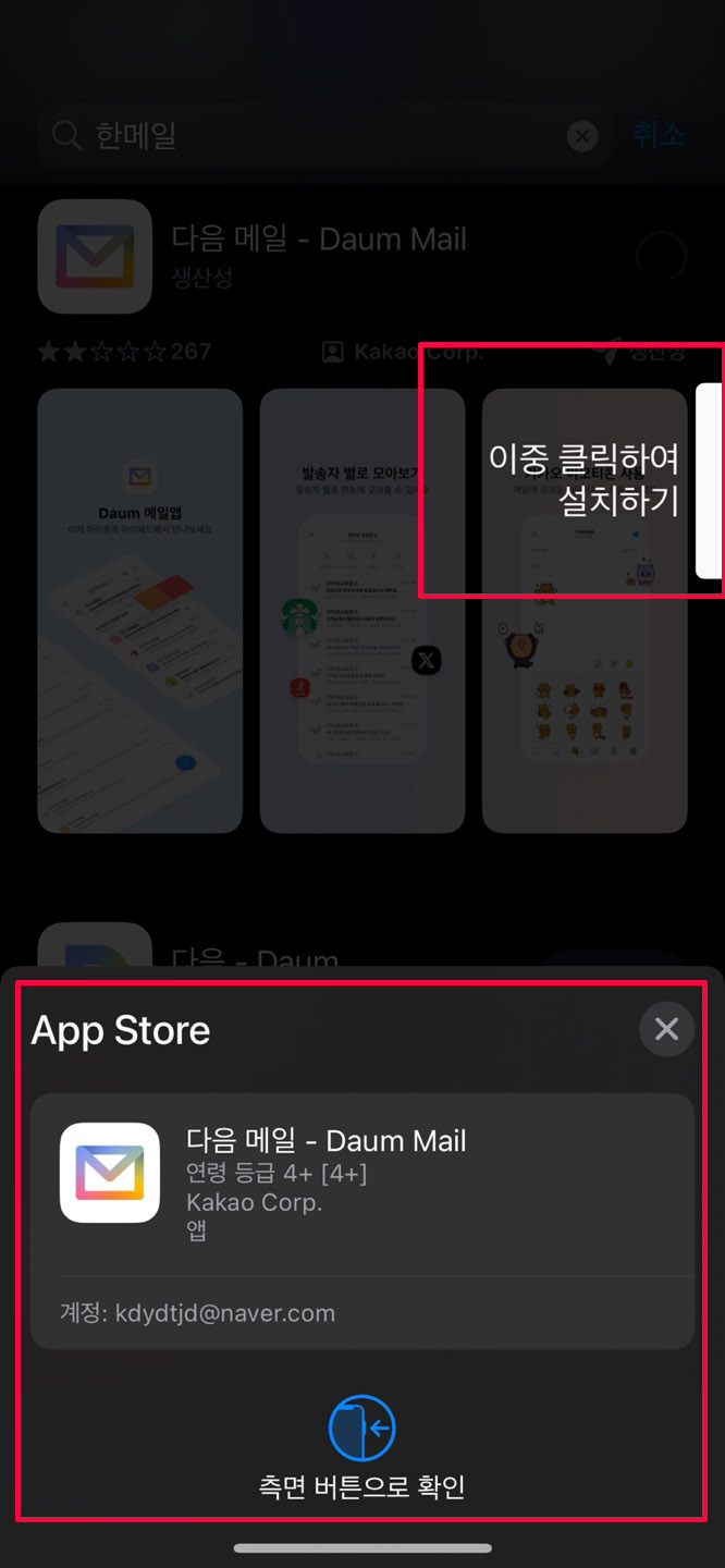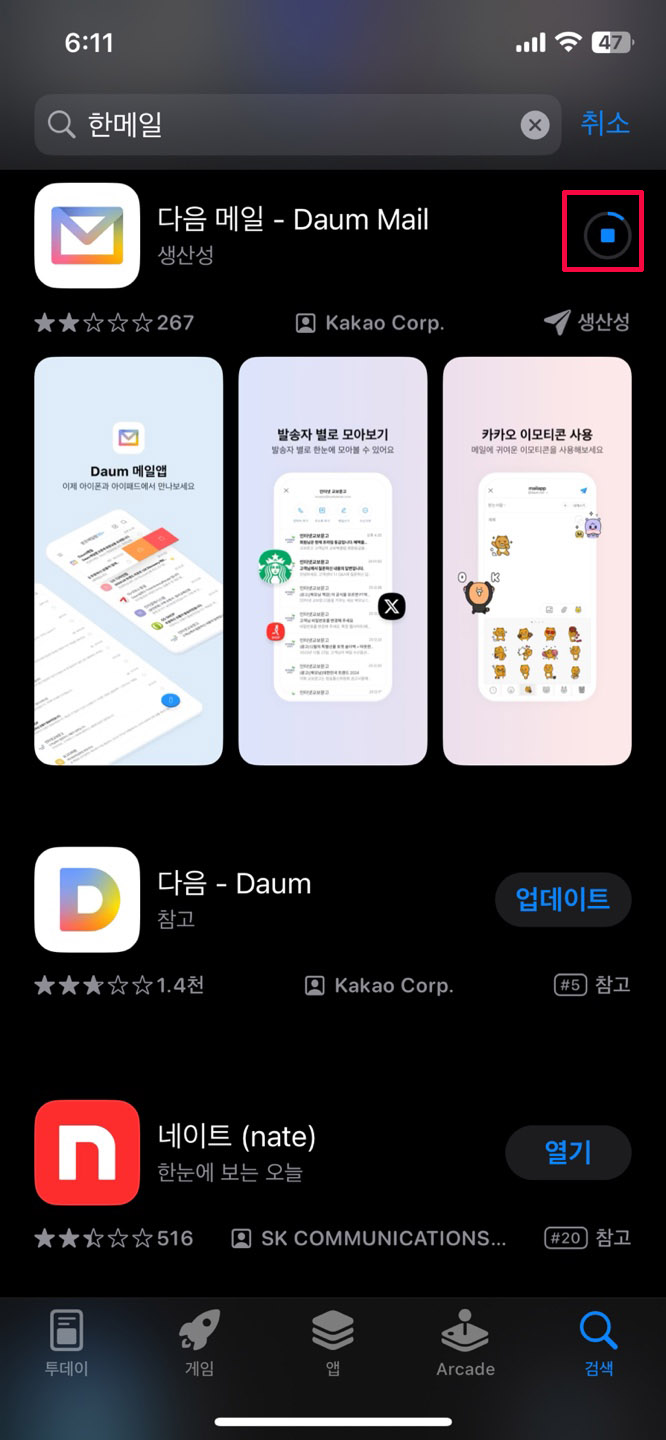 앱 스토어에서 검색 창에 "한메일"이라고 입력 후 검색합니다.