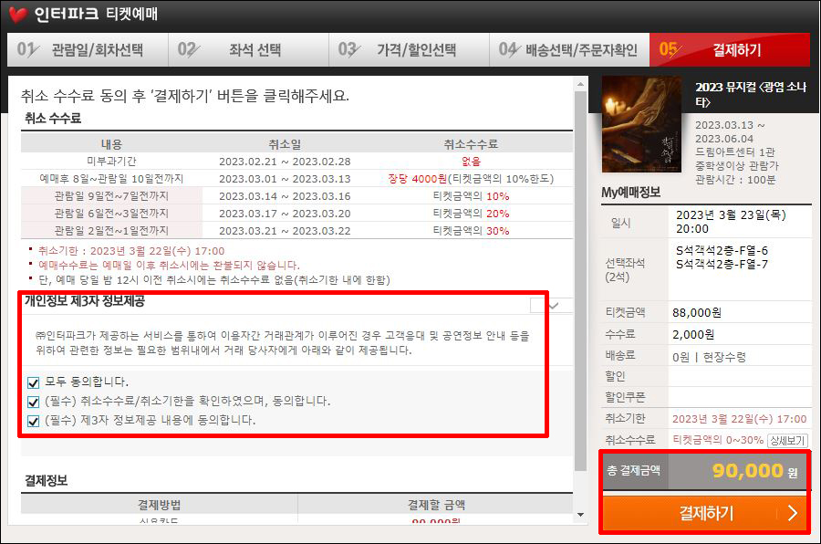 ⑦ 취소 수수료 확인 → 개인정보 정보 제공 <모두 체크> → 총 결제금액 확인 → 결제하기 → 예매완료