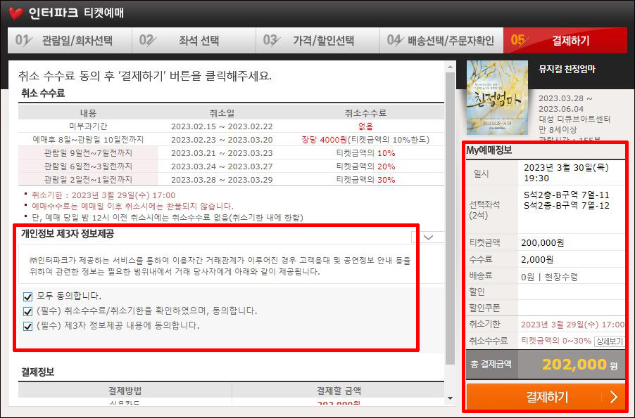 ⑦ 취소 수수료 및 개인정보 정보제공 <모두 동의 선택> → 결제하기 → 예매완료