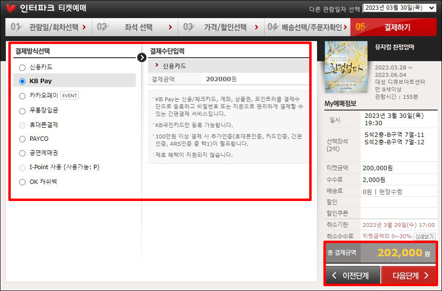 ⑤ 티켓수령방법 선택 → 예매자 정보 확인 → 총 결제금액 확인 → 다음단계