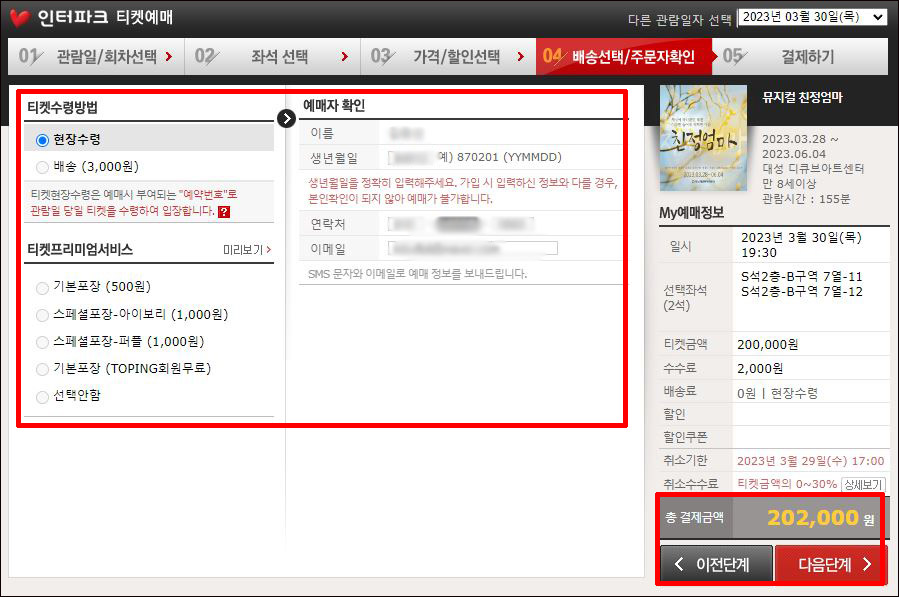 ⑤ 티켓수령방법 선택 → 예매자 정보 확인 → 총 결제금액 확인 → 다음단계