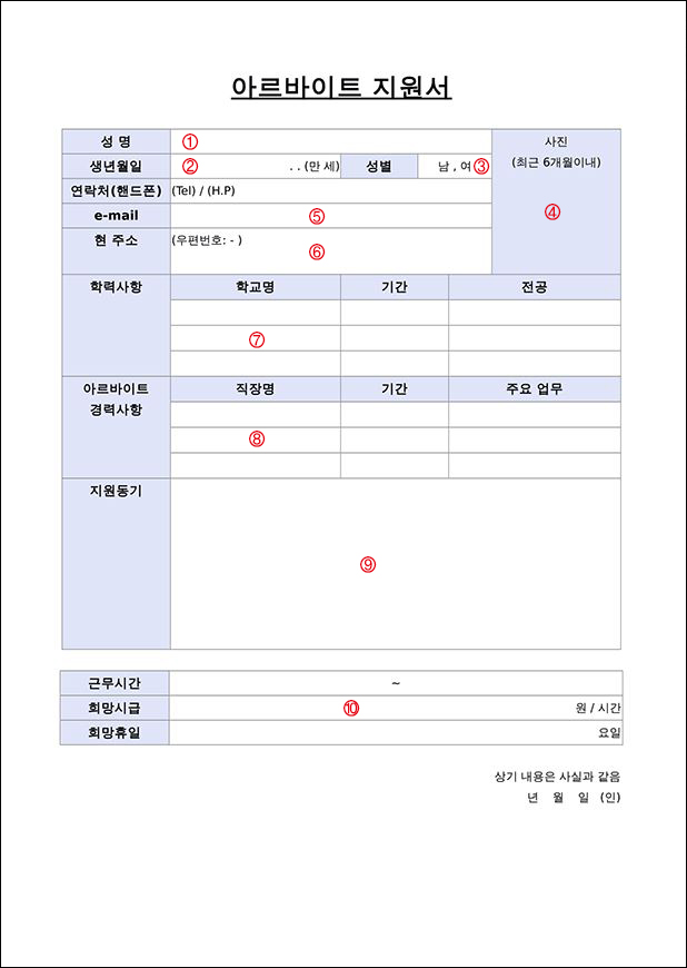 아르바이트(알바) 이력서 양식 무료 다운(최신)