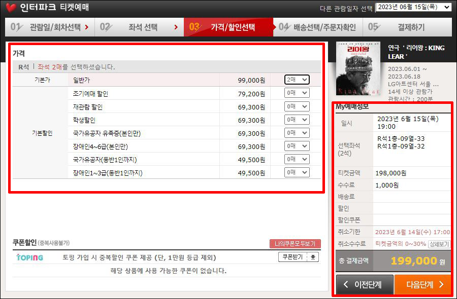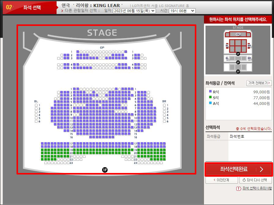 위와 같이 예매가 진행되고 결제 완료 시 예매가 완료된다. 이순재 배우가 펼치는 마지막 리어왕을 놓치지 마시길 바란다.