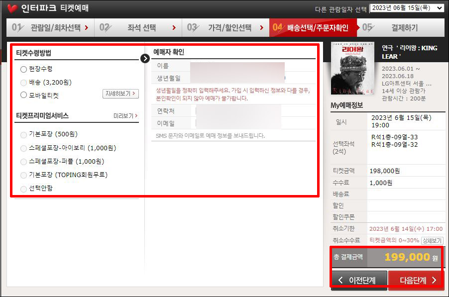 ⑤ 티켓 수령방법 선택 → 예매자 정보 확인 → 결제금액 확인 → 다음단계