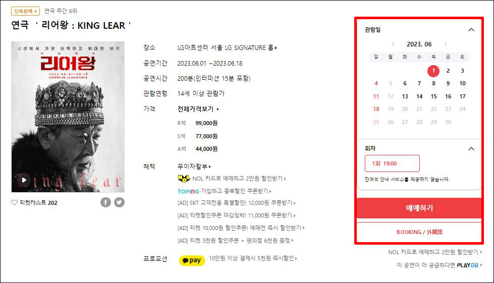 셰익스피어 비극 시리즈 "리어왕"을 원작으로 고대 브리튼 왕국의 리어왕은 단 16회의 무대만 펼쳐진다. 리어왕의 예매방법을 다음과 같이 소개한다. 예매는 인터파크 홈페이지를 예로 소개하니 아래를 참고하길 바란다.
