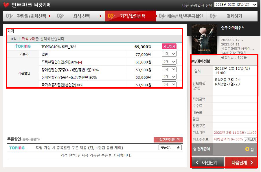④ 가격 및 할인 선택 > 매수를 선택 > 마이예매정보 확인 후 다음단계를 클릭하세요