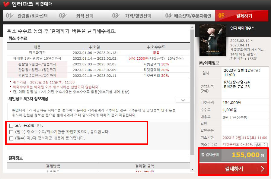 ⑦ 취소수수료 정보 확인 > 모두 동의 체크 > 결제하기 > 예매 완료