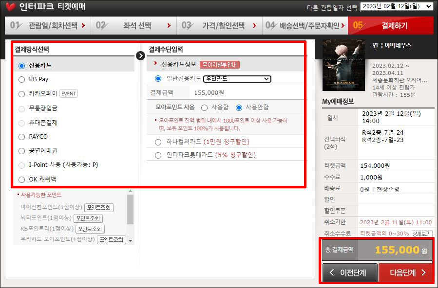 ⑤ 티켓수령방법 선택 > 예매자 정보 확인 및 수정 > 총 결제금액 확인 > 다음단계