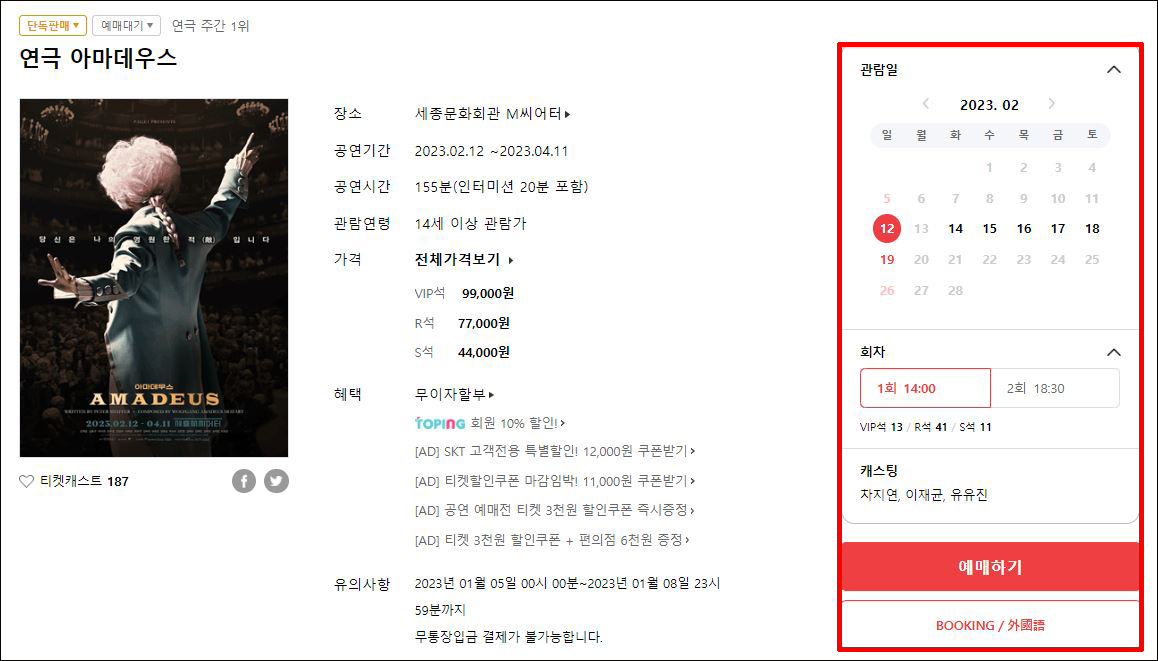 ① 아마데우스 예매 페이지로 이동합니다.