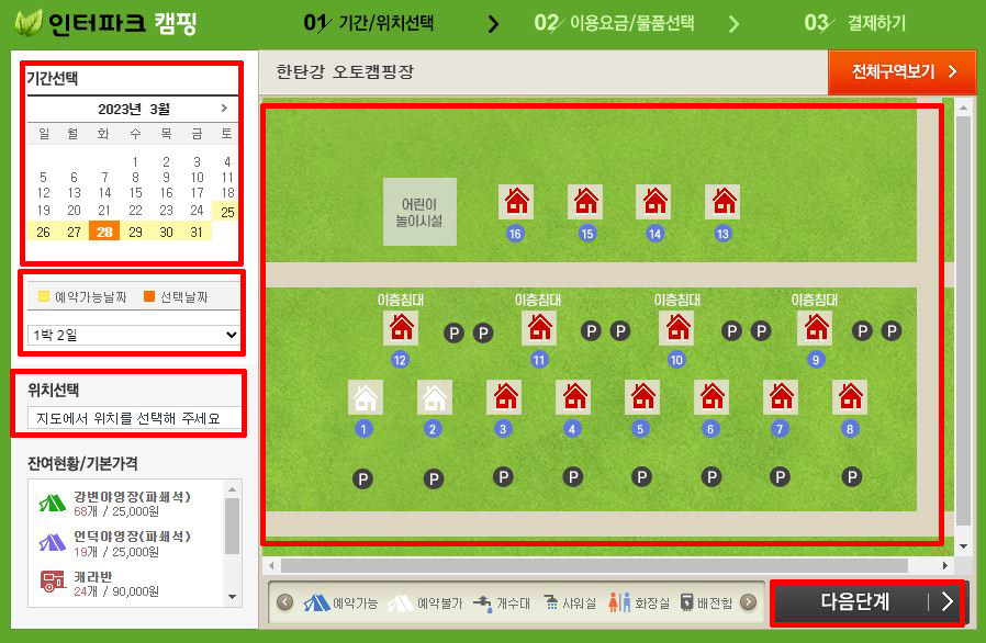 ③ 기간선택 → 우측의 지도에서 원하시는 캠핑 종류 선택 → 다음 단계