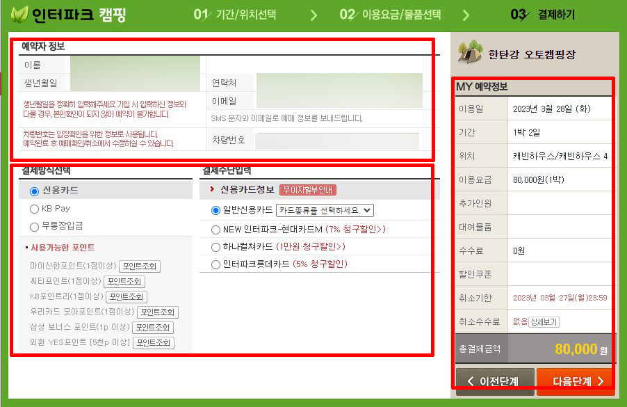 ⑥ 예약자 정보 기입 및 수정 → 결제방식 선택 → 결제수단 입력 → 총 결제금액 확인 → 다음단계