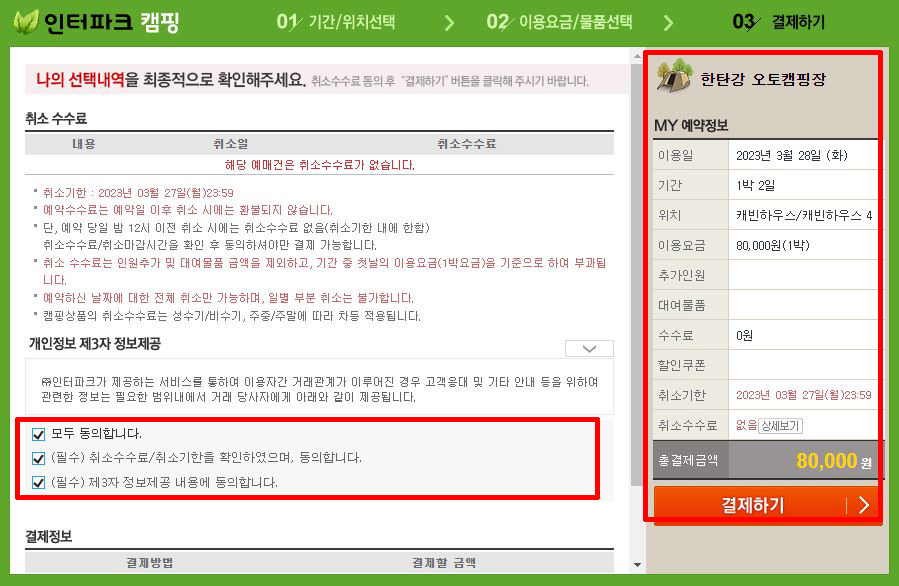 ⑦ 개인정보 제3자 정보제공 하단 모두 체크 → 최종 확인 후 결제하기 클릭 → 예약 완료