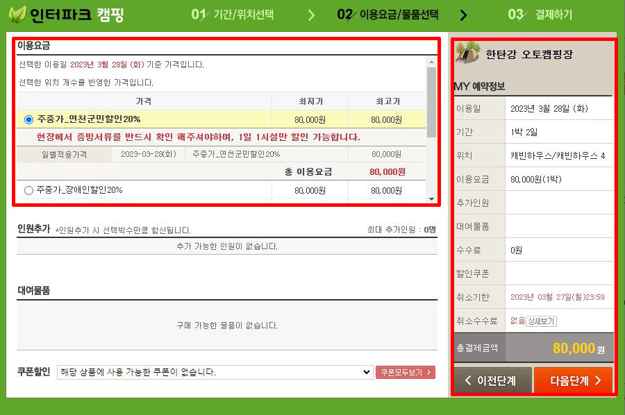 ⑤ 이용요금 확인 → 인원추가 및 대여물품 확인 → 예약정보 확인 → 다음 단계