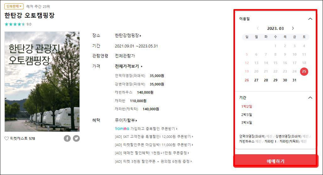 ① 위의 한탄강 오토캠핑장 <캠핑장 예매>를 클릭하시면 예약페이지로 이동한다.