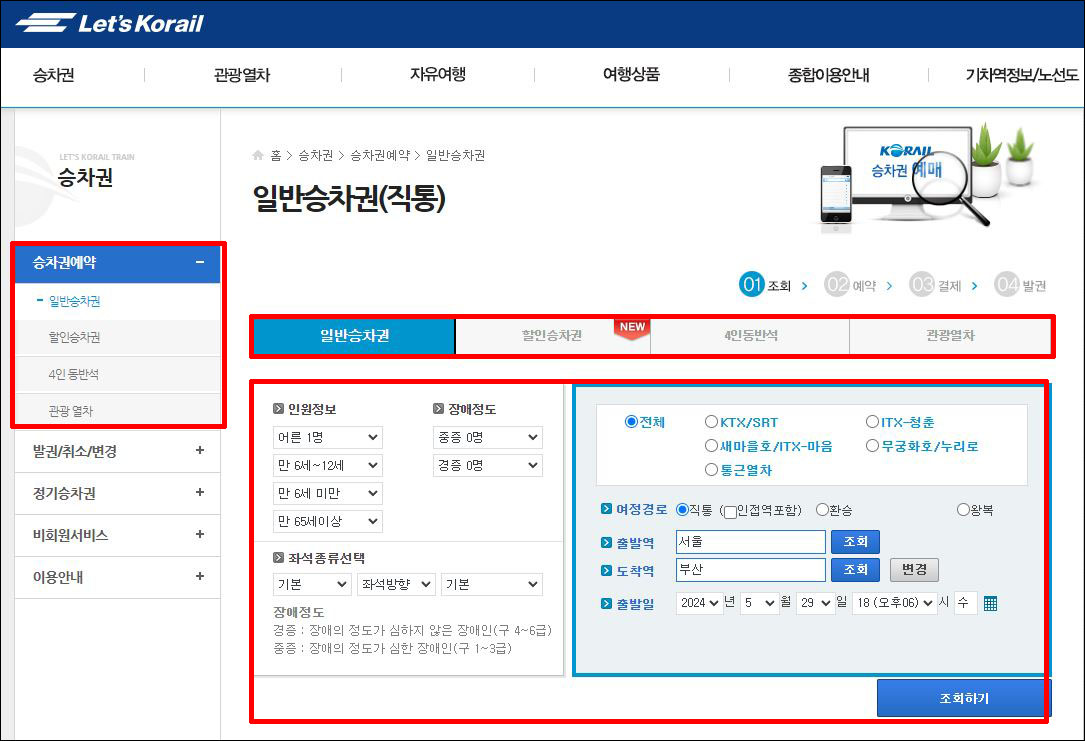 ④ 승차권 페이지에서 일반승차권, 할인승차권, 4인동반석, 관광열차의 종류를 선택할 수 있고, 인원정보, 장애정도, 좌석종류를 선택합니다.