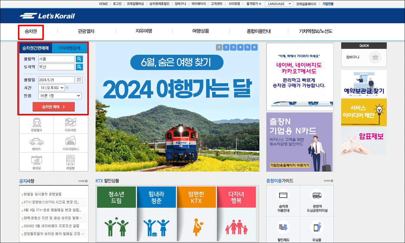 코레일 홈페이지에서는 승차권(기차, 열차) 예매부터 기차 여행 상품, 운행 정보까지 다양한 서비스를 제공하며, 국민의 편리한 이동수단 역할을 하고 있습니다.