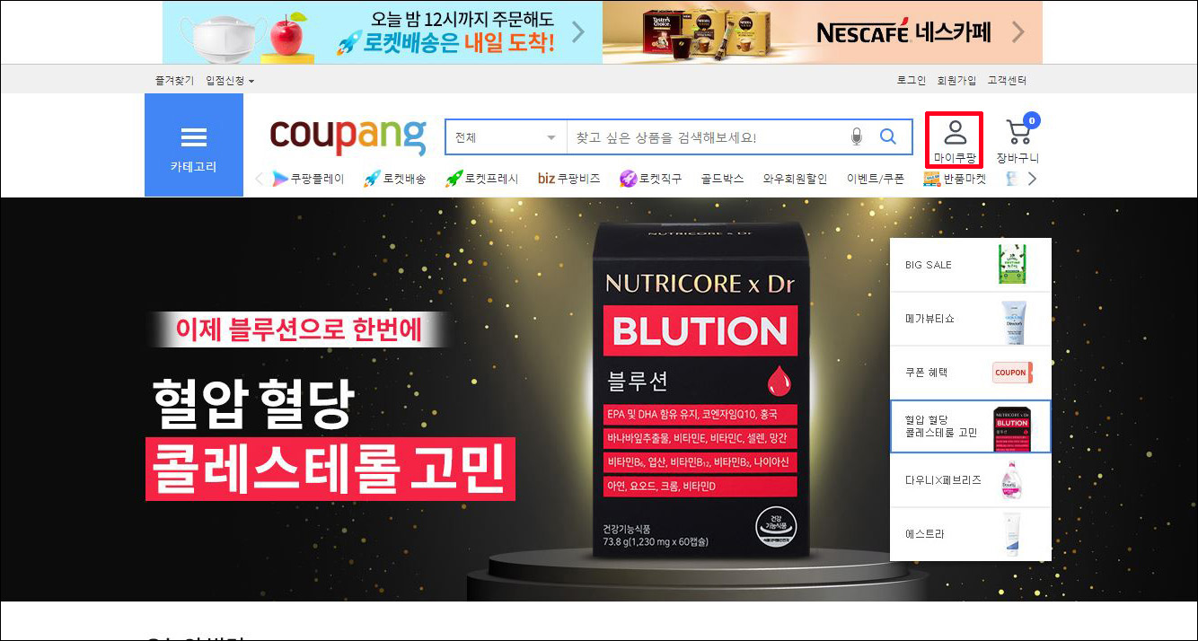② 쿠팡 홈페이지 상단의 "마이쿠팡"을 눌러주세요
