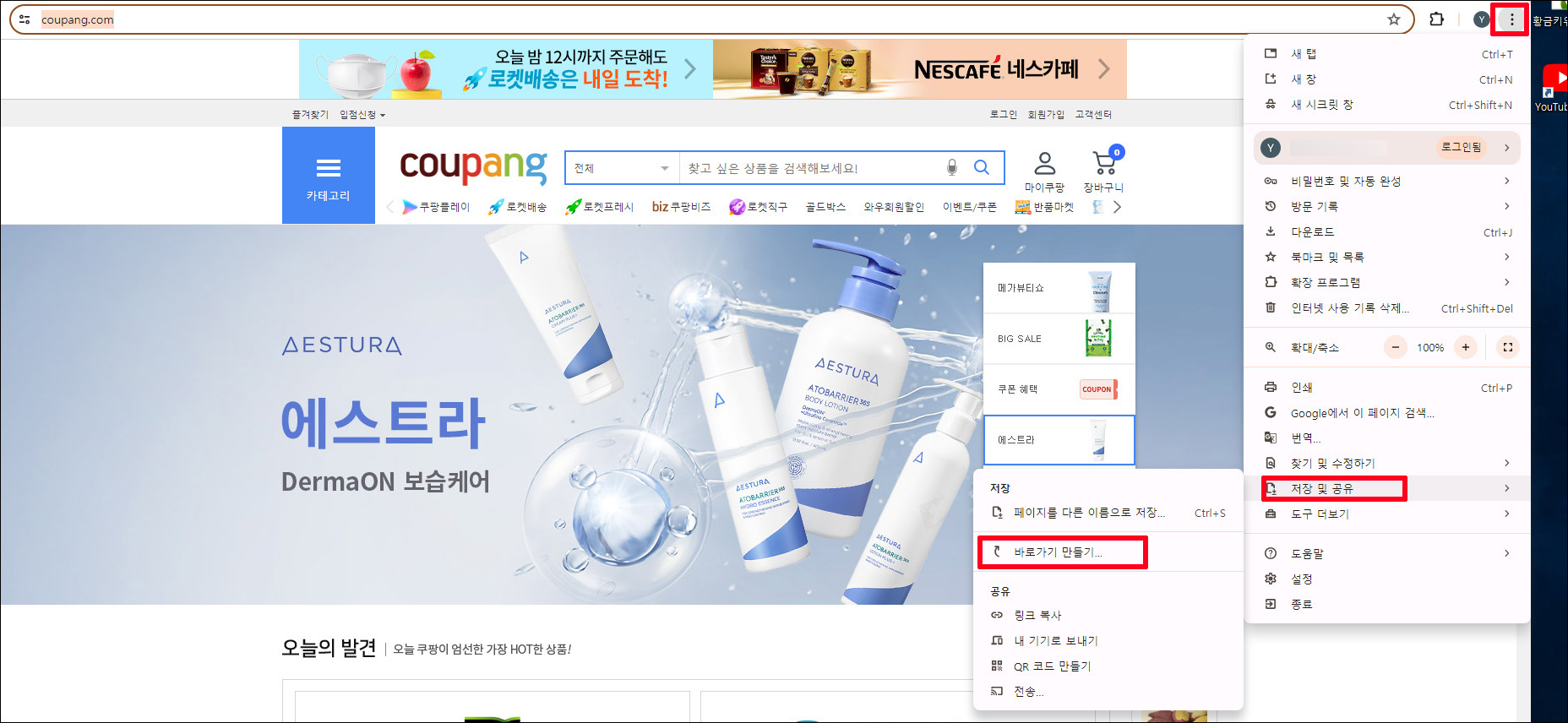 ② 주소창 우측의 점3개를 클릭하신 후 저장 및 공유 → 바로가기 만들기 → 클릭