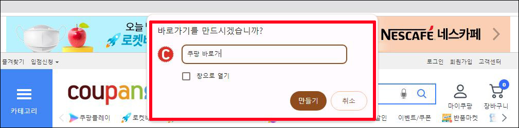 ③ 상단의 "바로가기를 만드시겠습니까?"창에서 "쿠팡 바로가기"입력 후 만들기를 눌러주세요