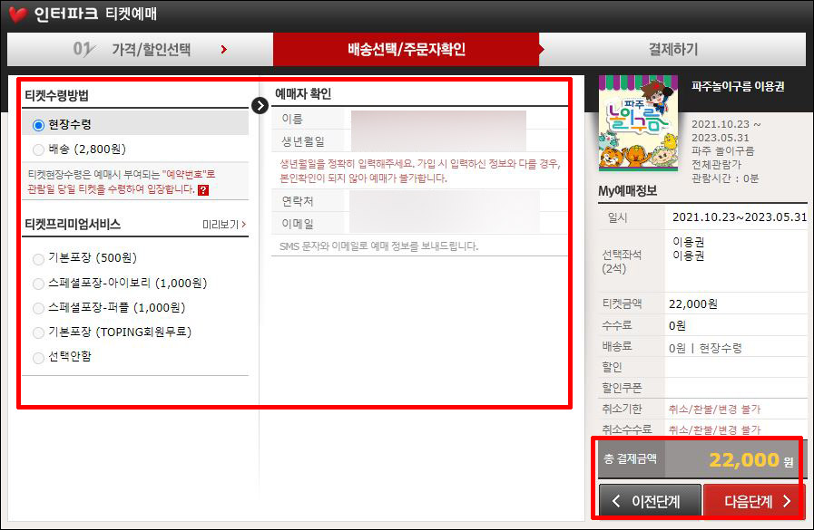⑤ 티켓수령방법과 예매자 정보를 확인한 후 다음 단계를 눌러 진행합니다.