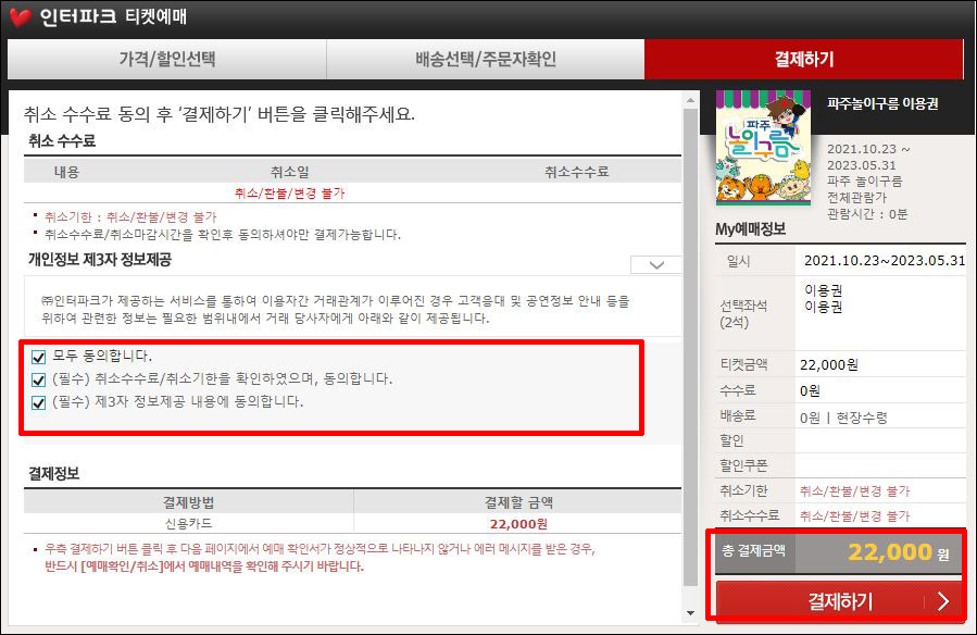 ⑦ 개인정보 정보제공에 <모두 체크> 하신 후, 결제하기를 눌러주세요