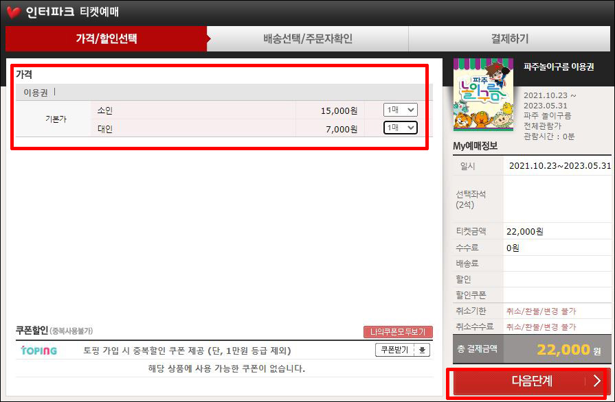 ④ 가격 및 이용권 매수를 선택하신 후 다음 단계로 진행합니다.