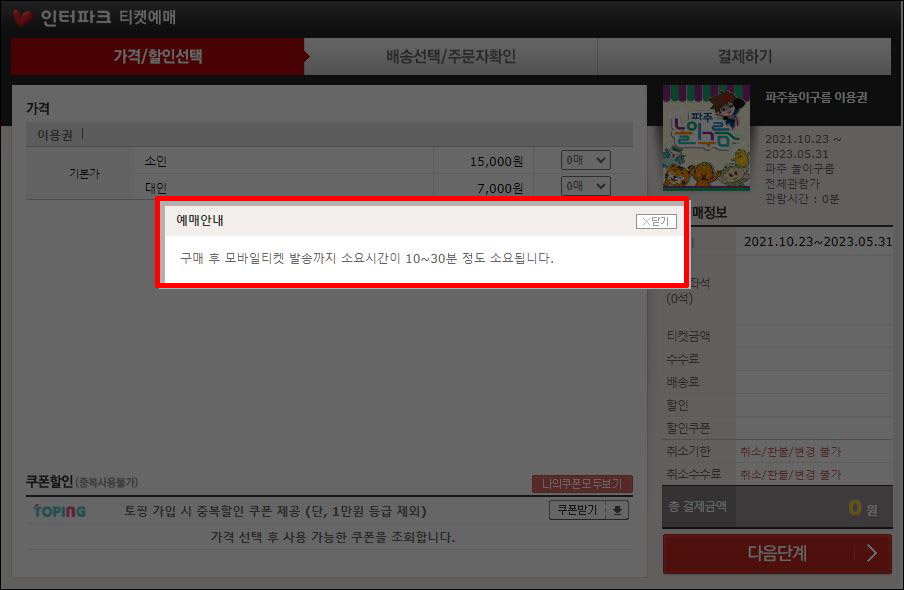 ③ "구매 후 모바일티켓 발송까지 10~30분 정도 시간이 소요됩니다" 예매안내 페이지를 닫아주세요