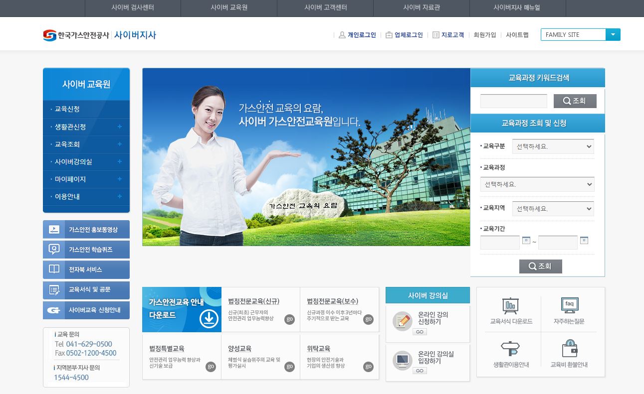 한국가스가스안전공사 사이버지사에서는 사이버 교육원을 운영하며, 교육신청, 생활관신청, 교육조회, 사이버강의실 등의 서비스를 운영하고 있습니다.