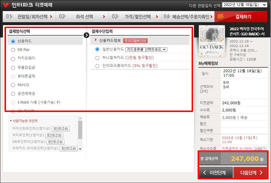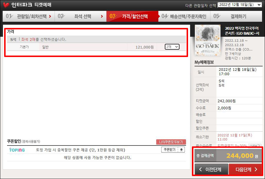 5. 가격정보와 매수를 선택하시고, 우측의 예매정보를 확인 후, 다음단계를 눌러주세요