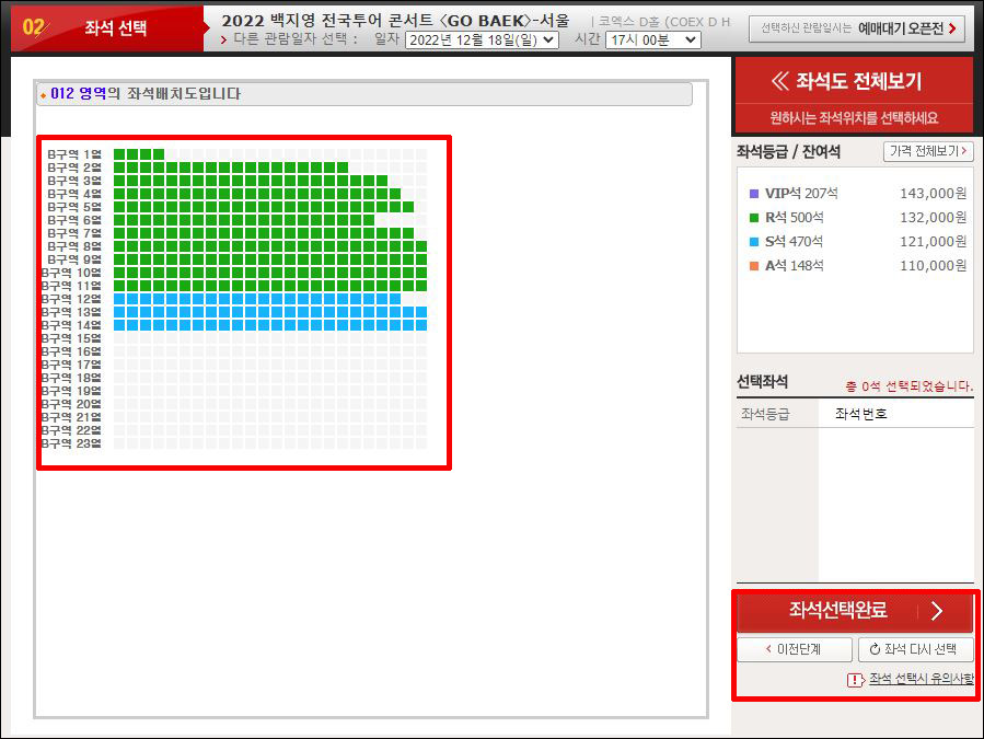 2. 원하시는 등급과 잔여석을 확인하시고 좌석선택완료를 눌러줍니다.