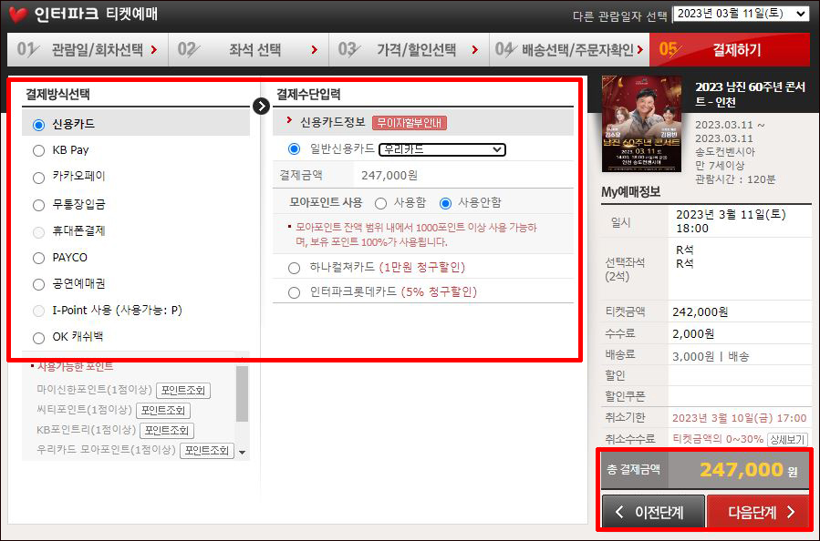 ⑦ 결제방식선택하시고 결제수단을 입력 > 총 결제금액 확인 > 다음단계 > 예매 완료