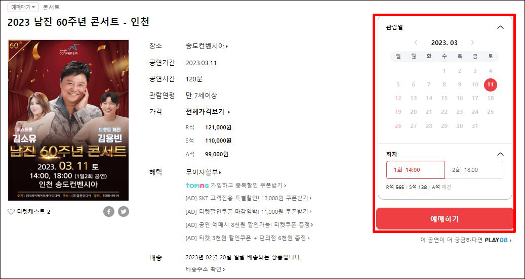 ① 남진 60주년 콘서트 <티켓예매>를 클릭하여 예매 페이지로 이동합니다.