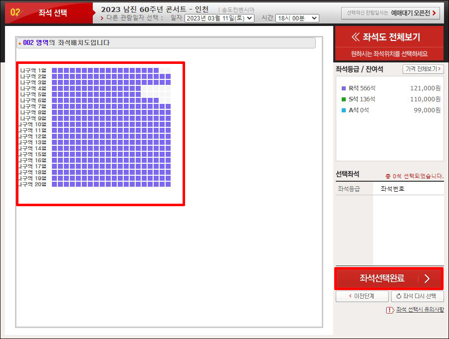 ④ 원하시는 구역의 남은 좌석을 선택 > 좌석선택완료 클릭합니다.