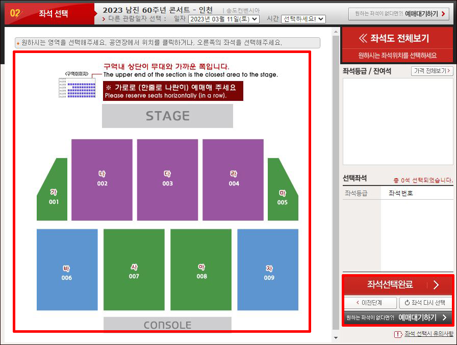 ③ 원하시는 좌석 구역을 선택 > 좌석선택완료를 클릭합니다.