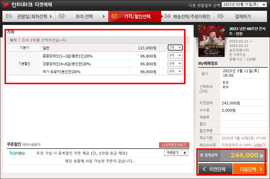 ⑤ 가격 및 할인정보 확인 > 매수 선택 > 마이예매정보 확인 및 총 결제금액 확인 > 다음단계 클릭